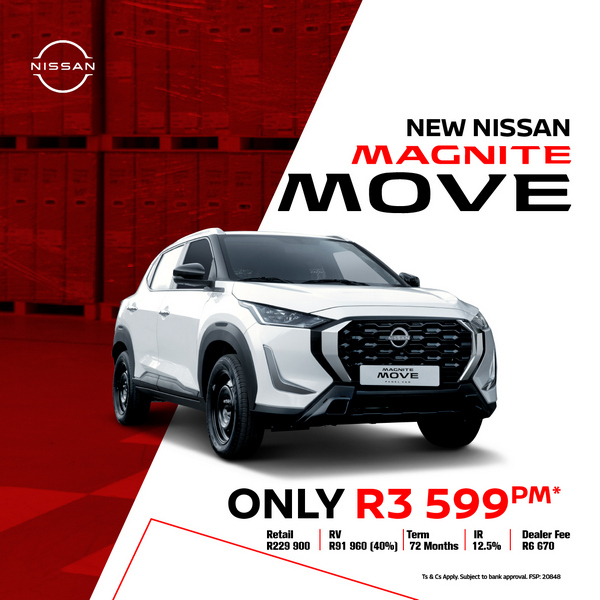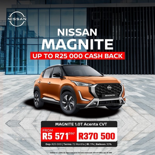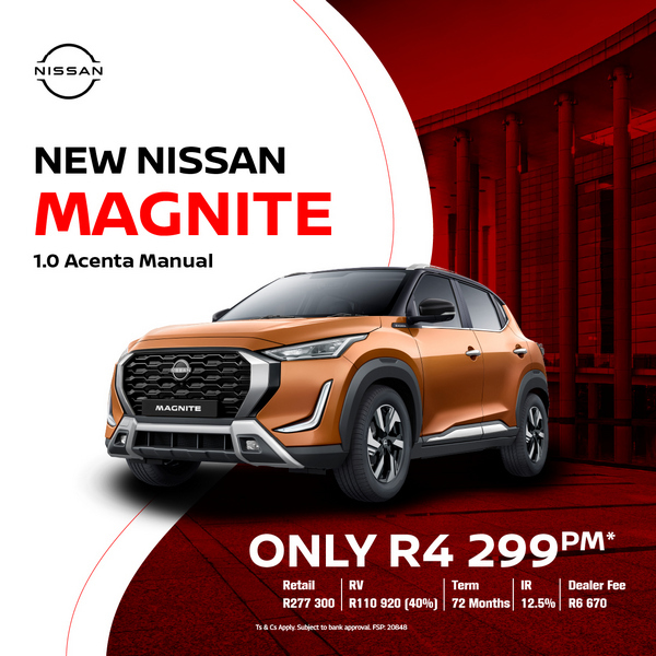*Nissan Finance Disclaimer: Monthly instalment and total cost of credit includes Bank Initiation fee of R1,208 (incl VAT) and monthly service fees of R69. Short term insurance is mandatory on all Nissan Finance contracts. Interest rates are linked to prime (currently 10%) and accordingly are subject to change in the event that prime changes. Finance offers subject to approval from Nissan Finance, a product of WesBank, a division of FirstRand Bank Ltd, an authorised financial services and credit provider (NCRCP20). Offer valid while dealer stocks last. Prices and specifications subject to change without prior notification. Recommended retail price excludes PDI, all on-road costs (licence & registration), metallic paint & accessories. Derivative shown as per advertised recommended price. Unless otherwise stated, all amounts are inclusive of VAT.
